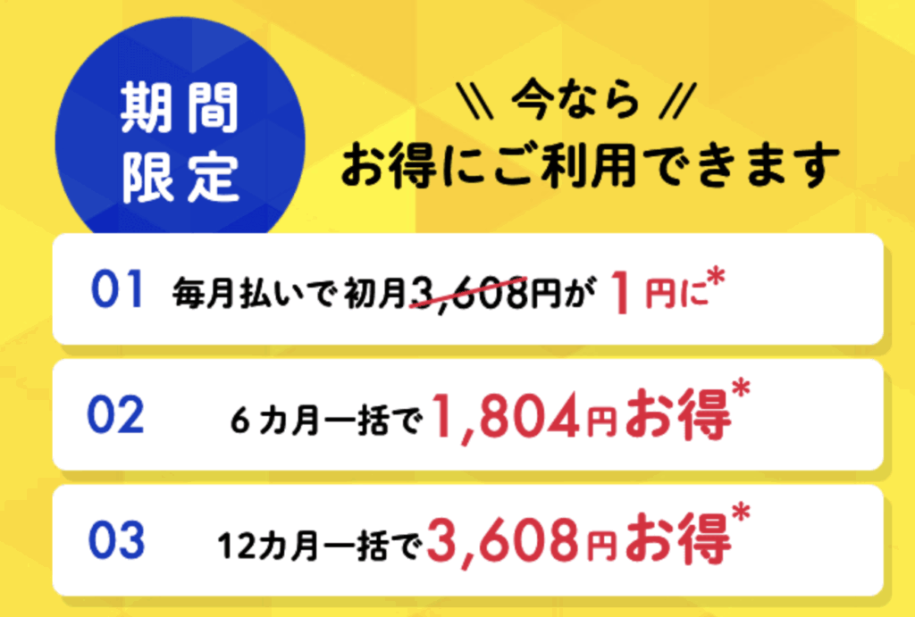 これを使うと、プレミアムコース(通常3,608円)が初月たった1円で始められるんですよね。スタンダードコース(通常3,278円)も、初月1円です。