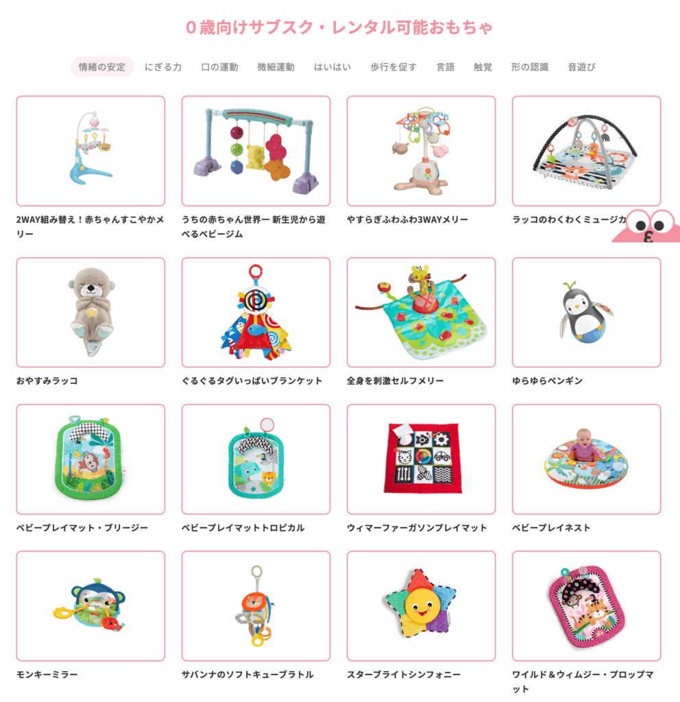 完全にお任せではなく、ある程度自分でコントロールしたい方にぴったりです。700点以上のおもちゃが公開されているので、事前にどんなものがあるか確認できる安心感があります。
