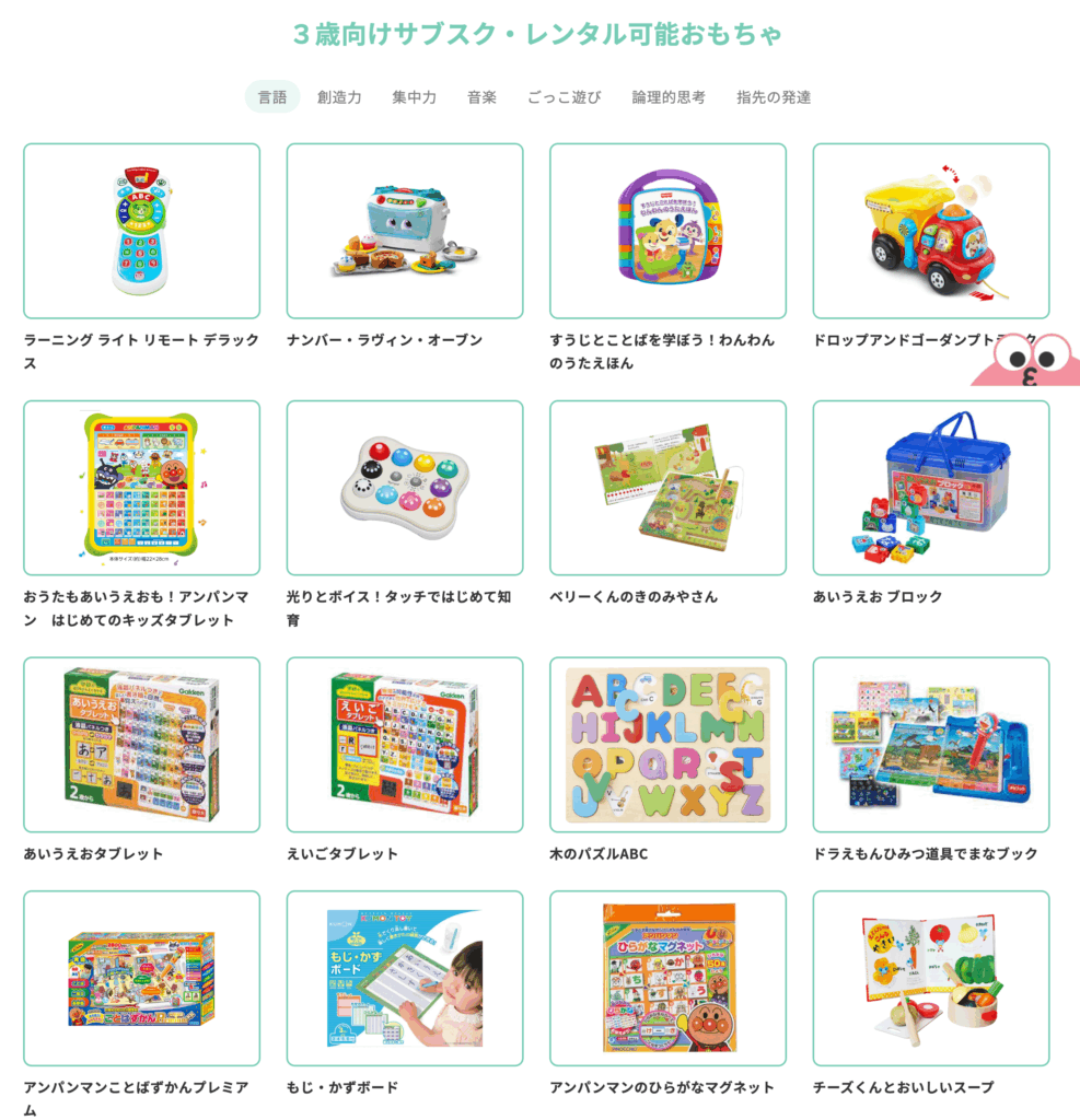 実は、チャチャチャには他社と比較しても優れた特徴があって、おもちゃ一覧から自分で選べたり、対象年齢に合わせたプランが充実していたりと、おすすめできるポイントがいくつもあるんです。