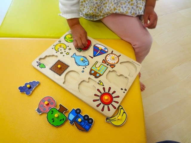 特に型はめパズルの場合、ピースを取り出すためのつまみがないと、小さな指では掴みにくいことがあるんです