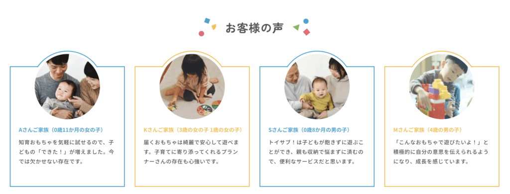 ちょうど1歳の子供がいて、おもちゃも増えてきていました。片付けるのも大変だし、新しいおもちゃが欲しいや買ってもすぐ飽きてしまったりとなんだかムダだなと思っていた時にこのサービスを見つけました。値段もリーズナブルで知育的なおもちゃから色々なおもちゃを試せるので購入することを考えると出費も抑えられるし、気に入ったものであれば延長や購入も出来るのが魅力ですね。知育のおもちゃって結構値段も高いんですよ。